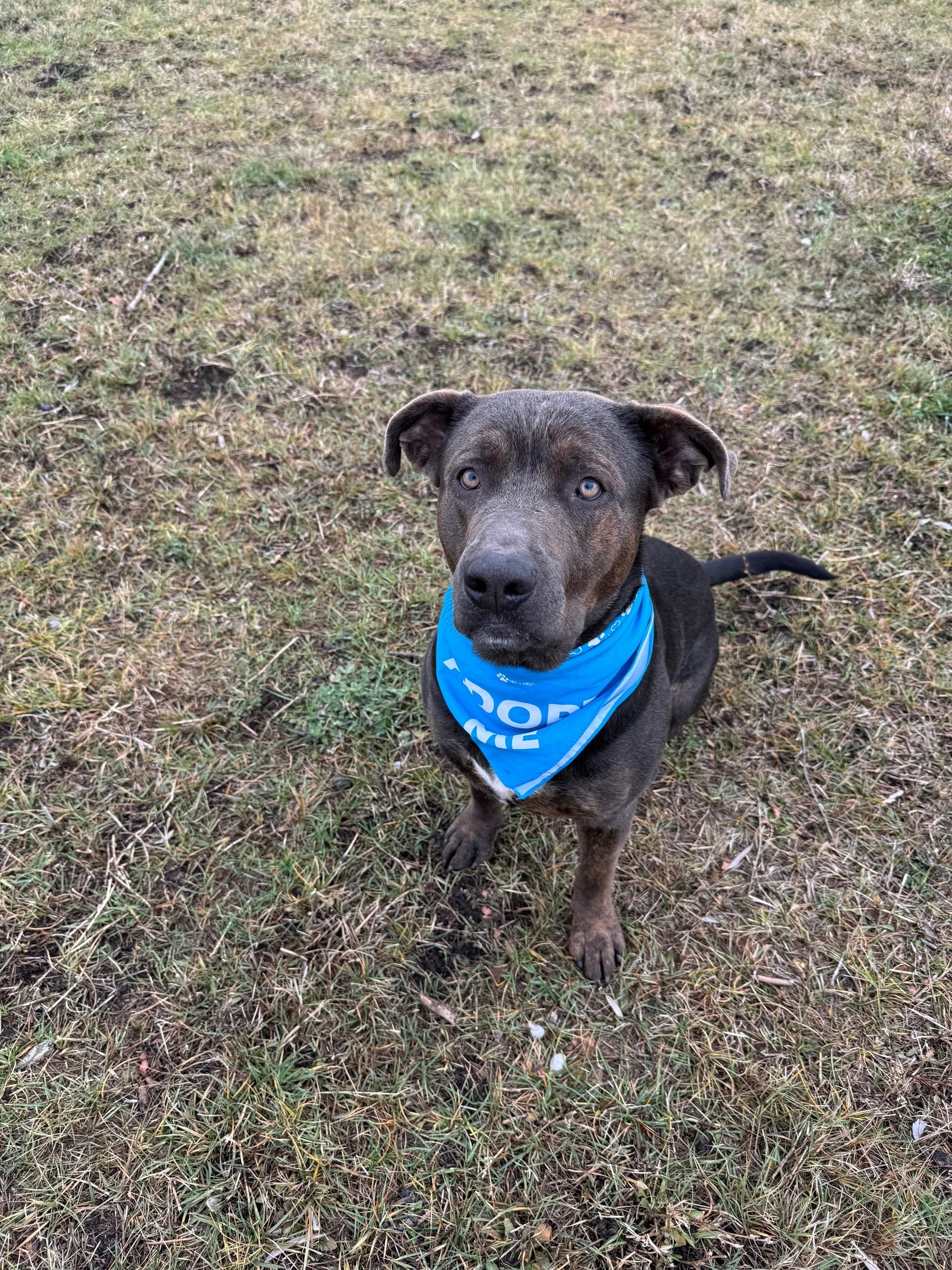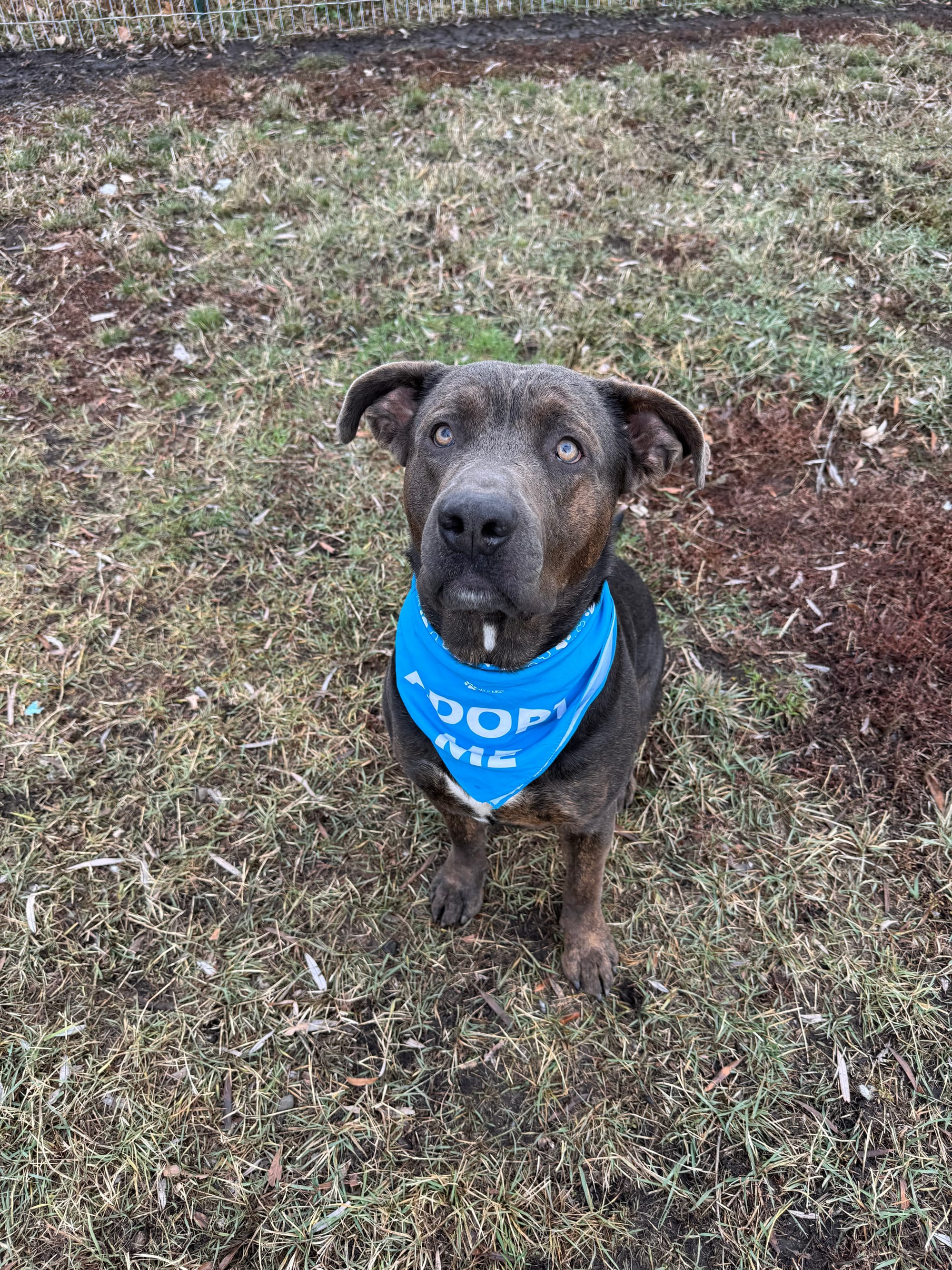 Age: 1.5 years Breed: Cane Corso / Pitbull Mix Weight: 87 lbs Energy Level: Low Good With: Dogs, Kids, Indoor Cats