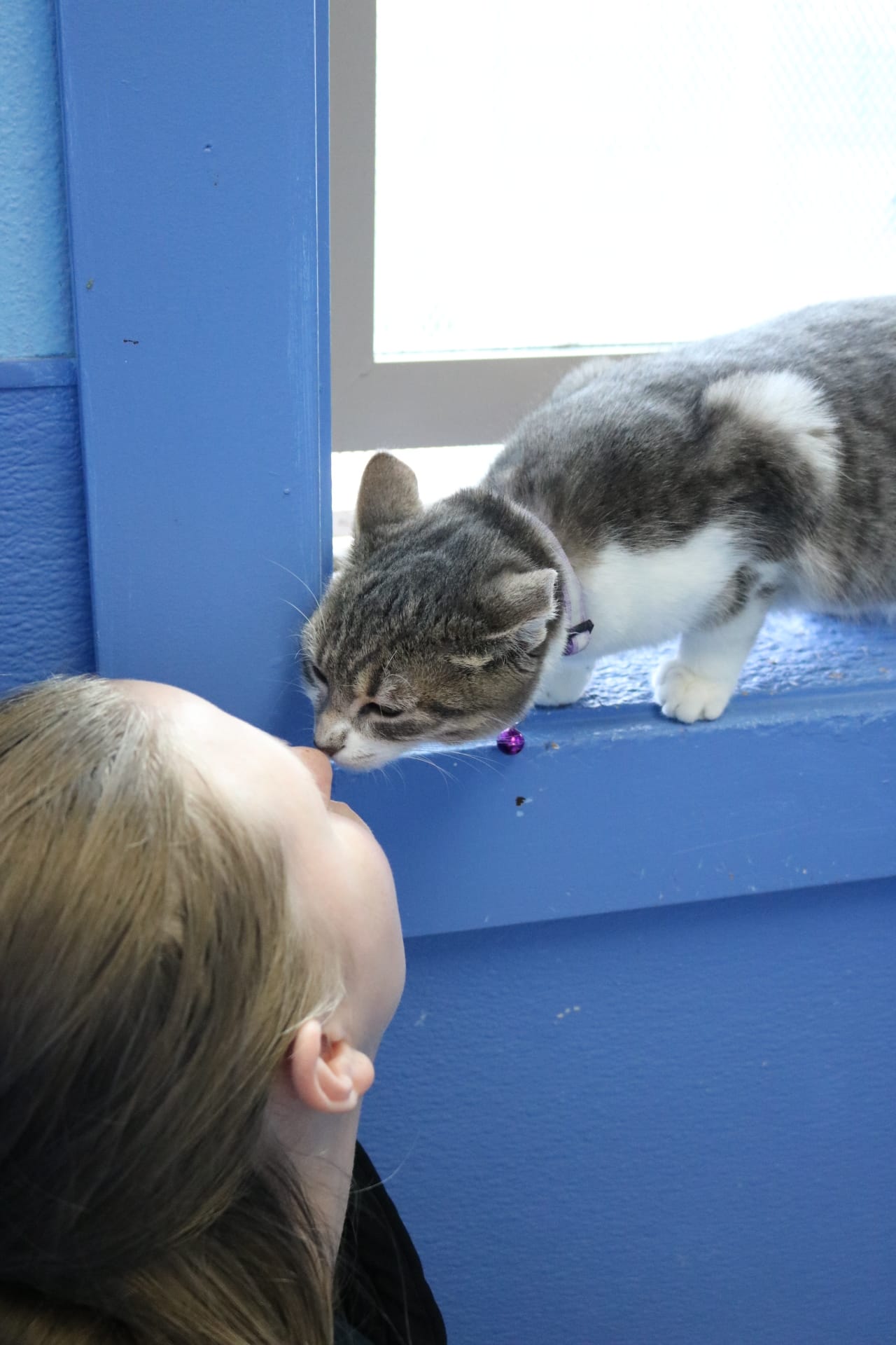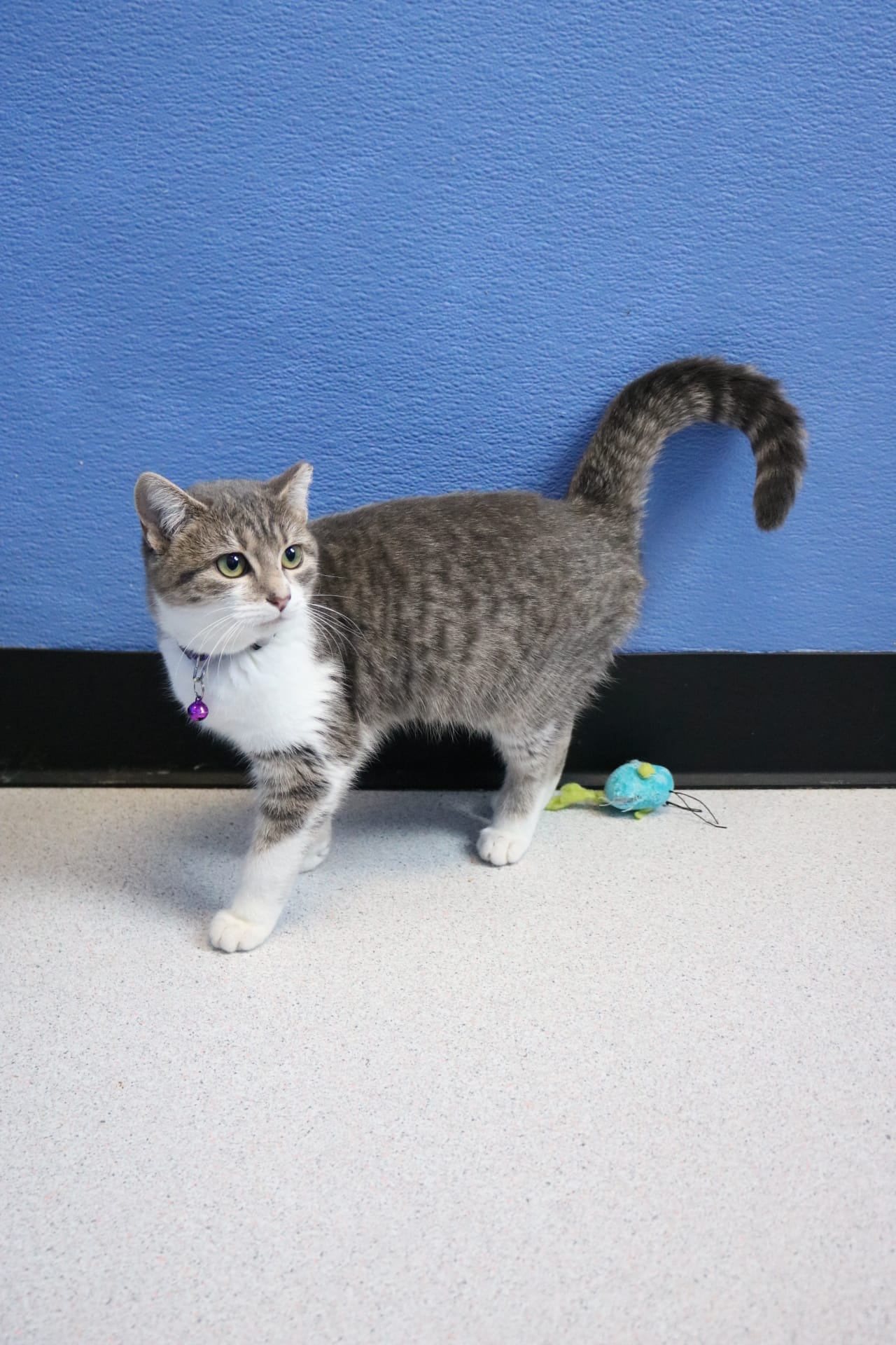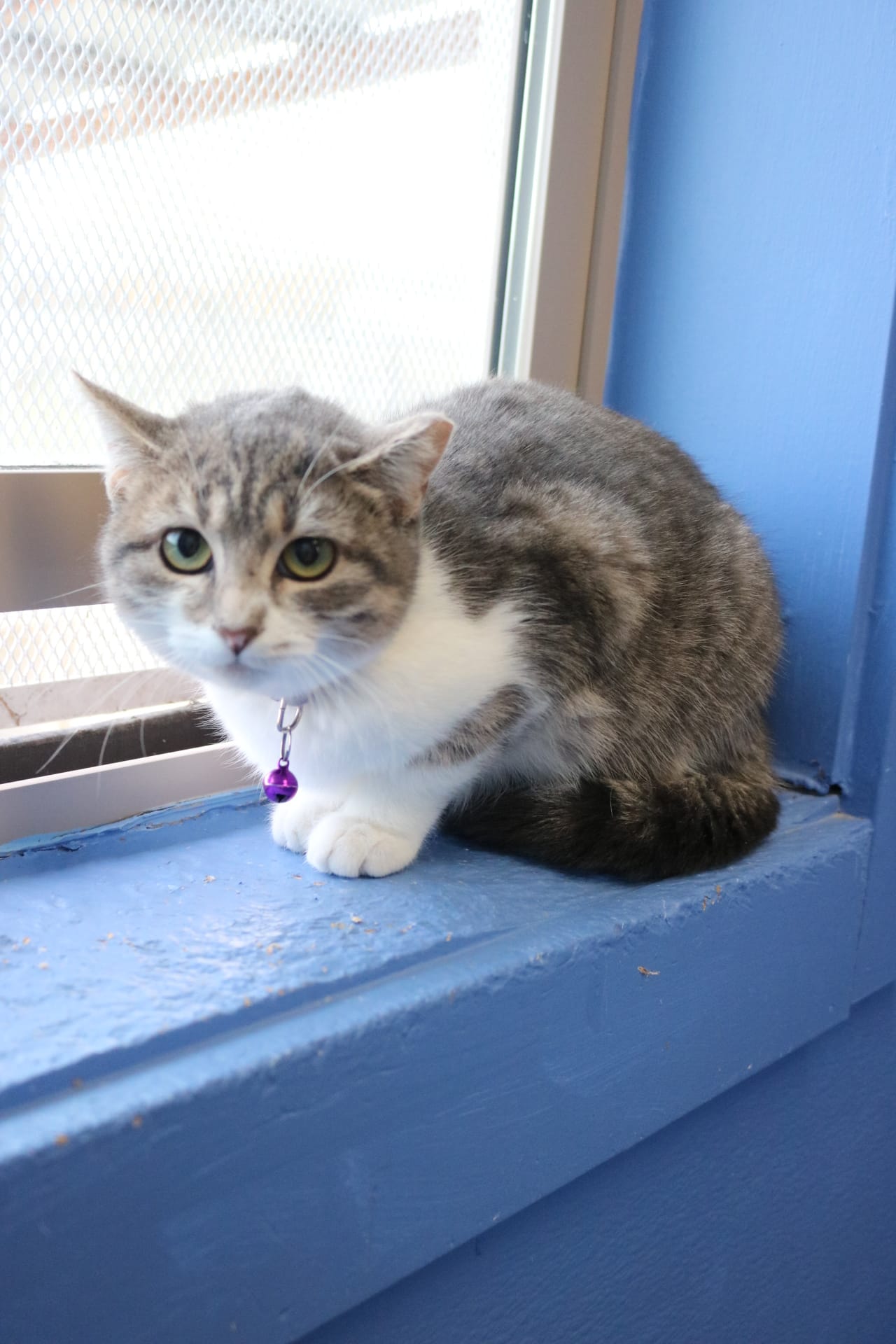 Meet Maggie! Born on 04/15/2025, Maggie is a stunning grey and white tabby with a sweet, gentle personality. She’s already shown that she gets along well with other cats and has clearly had some thoughtful care—her previous owner even trained her to sit and stand up for treats! While she’s been a bit too stressed in her new environment to show off her tricks just yet, we’re confident her playful side will shine once she feels safe and settled. Maggie would do well in a calm, loving home where she can decompress at her own pace and be given the chance to show off just how special she is.