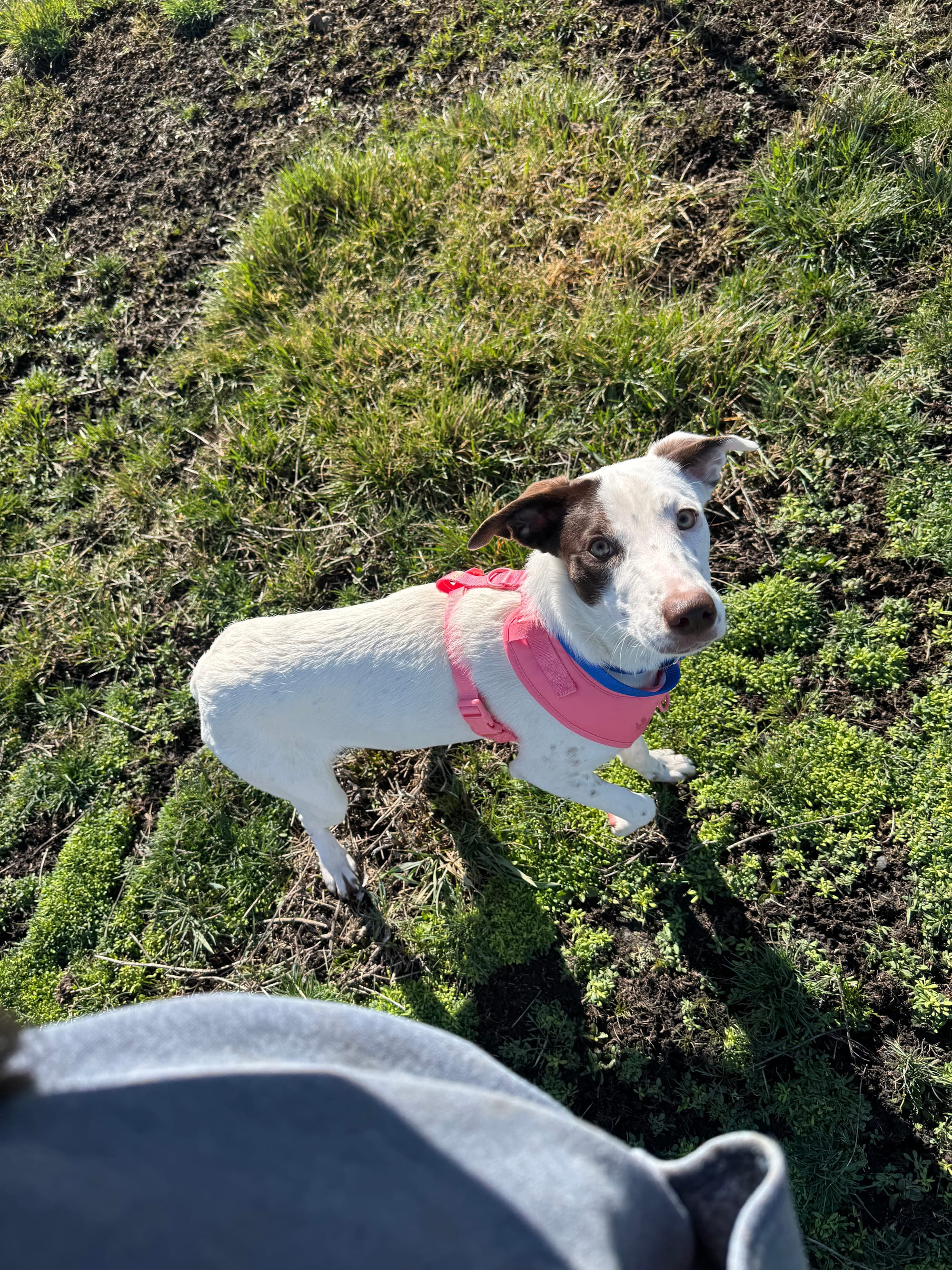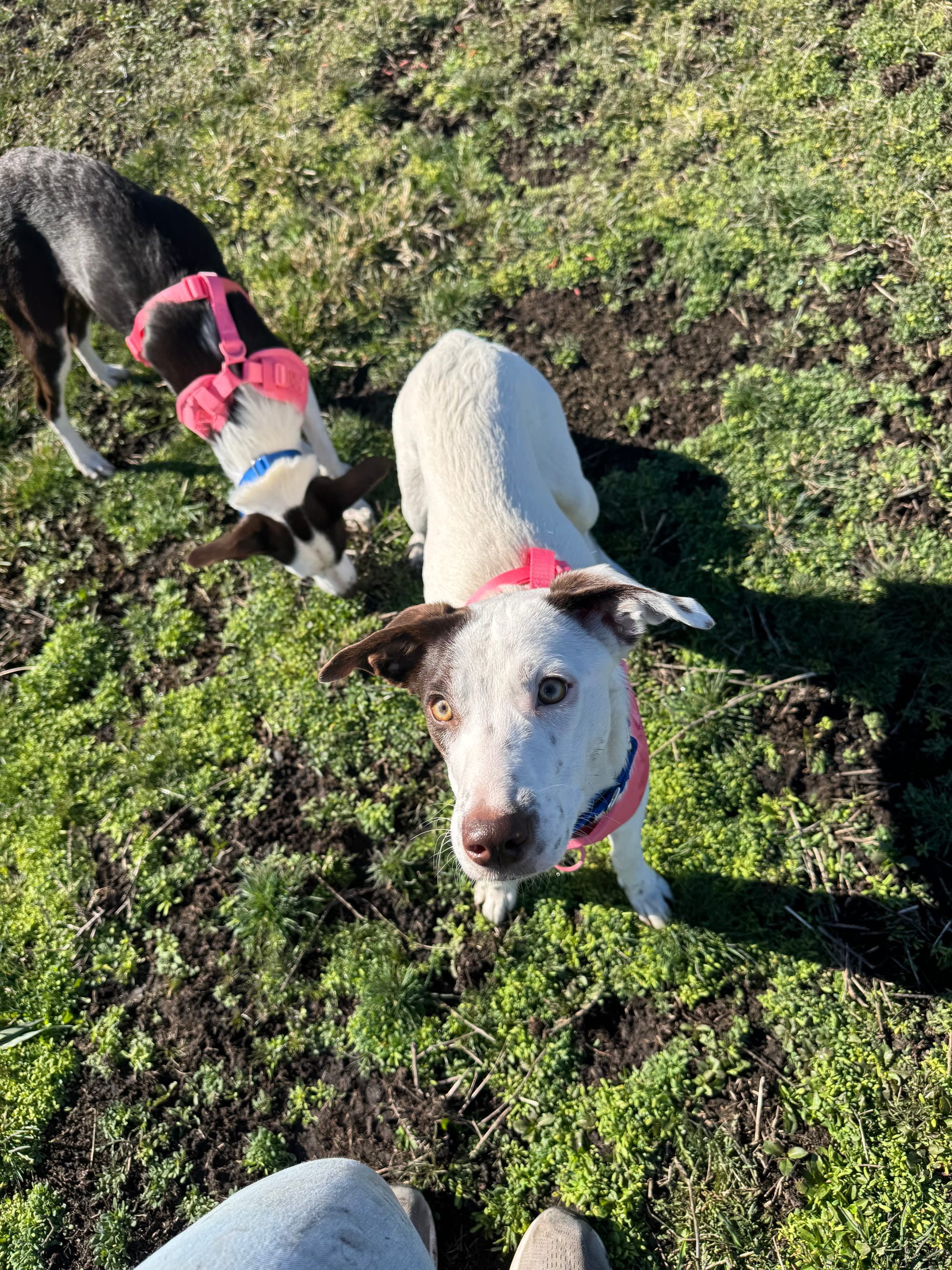 Zara loves to climb, explore, and keep an eye on the birds. Her curious, adventurous spirit makes her a great match for someone who enjoys an active dog with a busy mind. Mostly white with a touch of black, her unique look perfectly matches her bold and expressive personality.